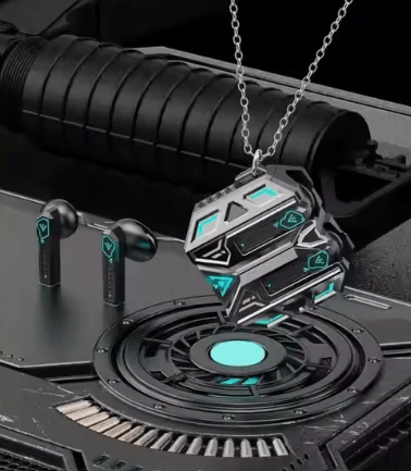 Gaming-Inspired Design (box art) – LED-lit, sci-fi styled charging case with matching earbuds for a gamer aesthetic.