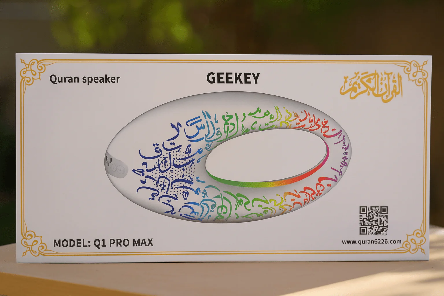 GeekeyQuran Speaker – A beautifully designed Quran recitation speaker with LED lighting, delivering high-quality sound and spiritual ambiance at home.
